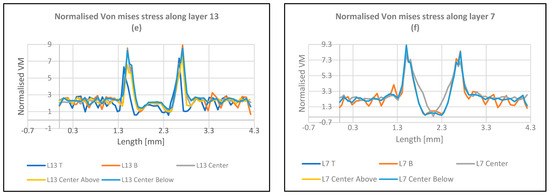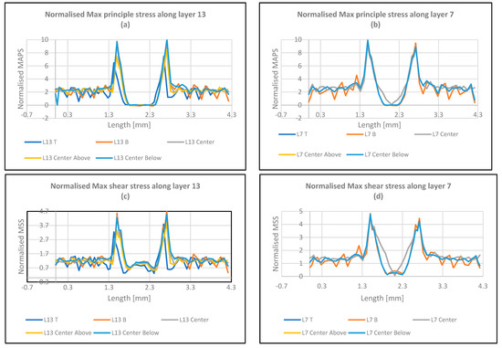 Graphical representations of normalized Max principal, Max Shear, and Von Mises stresses along layers 13 and 7 for the defective samples at a raster angle 45°.