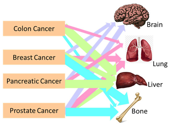 All types of cancers can spread. The mechanisms of spreading cancer are varied. These range from cancer invading normal tissue in its proximity, traveling through either the lymphatic system or blood vessels to other parts of the body, attaching to invading blood vessel walls and forming tumors, to the growth of new blood vessels that enable metastatic tumor growth. Different cancers have the propensity to metastasize to specific locations in the body, e.g., breast cancer and prostate cancer tend to spread to the bones, and colon cancer and pancreatic cancer spread to the liver, as shown in Figure 1. Metastasis is the cause of most patient deaths, yet the mechanisms of metastasis remain primarily unknown. The process is fundamentally described as a two-step process, with the initial dislocation of cancer from its primary site and transportation of cells to a distant site through blood and lymph systems, and the phenomenon of recolonization of cancer at the remote site [9].