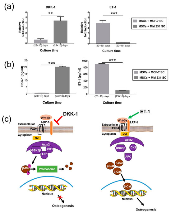 (a) Gene expression for breast cancer-related factors, DKK-1 and ET-1, in a bone metastasis in vitro model for MCF-7 and MDA MB231 breast cancer. (b) Release of DKK-1 and ET-1 into culture medium. ** p < 0.01 and *** p < 0.001 indicate significant difference. (c) Schematic showing the inactivation and stimulation effects of DKK-1 and ET-1, respectively, on osteogenesis. Reprinted with permission from [74]. Copyright © 2024 American Chemical Society.