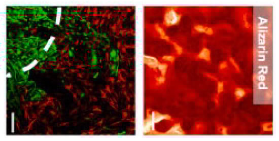 Confocal imaging of breast cancer cell migration into engineered tissues following seven days in co-culture and also alizarin staining to show mineralization. The dashed line denotes the interface with engineered tissues. Scale bar: 200 μm. Reprinted with permission from [79]. 0142-9612/© 2024 Elsevier Ltd.