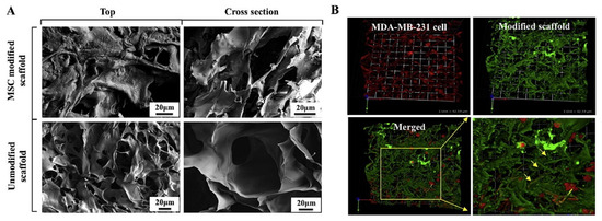 (A) SEM images of MSC-modified 10% nHA/chitosan scaffold and unmodified scaffold, compared to unmodified nHA/chitosan scaffold. (B) Confocal microscopy images showing the distribution of MDA-MB 231 (red color) cells in the modified scaffold after 24 h. Reprinted with permission from [83]. 1742-7061/2014 Acta Materialia Inc. Published by Elsevier Ltd.