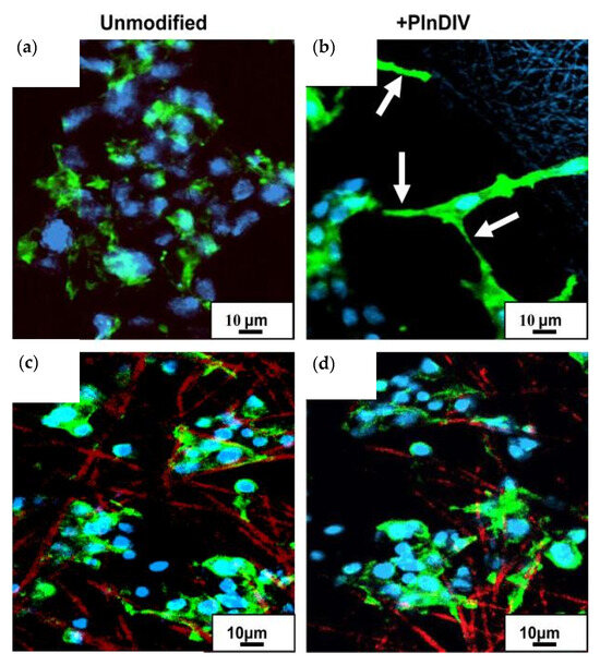 Image showing the reorganization of the cytoskeleton by C4-2B cells on membranes modified by PlnDIV. PCL–gelatin composite membrane with HFIP. (a) Unmodified PCL-gelatin composite membrane (b) PCL–gelatin composite membrane with HFIP modified with PlnDIV. (c) PCL–gelatin composite membrane with TFE. (d) PCL–gelatin composite membrane with TFE modified with PlnDIV. HFIP: 1,1,1,3,3,3-hexafluoro-2-propanol; TCE: 2,2,2-trifluoroethanol. Scale bar 10 μm. Reproduced with permission from [107]. 0142-9612/$ e see front matter 2010 Elsevier Ltd.