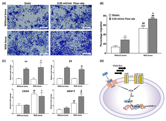 Evaluating the migration of PC3 cancer cells using transwell inserts showing the influence of bone under static and dynamic conditions. (A) Cell migration using crystal violet dye under static and dynamic conditions. (B) Plot showing the percentage of cell migration in static and dynamic conditions. (C) Plot showing the gene expression of genes related to cellular migration. (D) Schematic showing the mechanism of the role of CXCR4 and αv and β3 integrins in the increase in MMP-9 levels. Here * p < 0.05, ** p < 0.01, and *** p < 0.001 indicating a significant difference between static condition without bone. Similarly, # p < 0.05 and ## p < 0.01indicating a significant difference between dynamic sample without bone and other conditions. Likewise & p < 0.05 indicating a significant difference between the static and dynamic samples with bone. Reproduced with permission from [47]. CC license permission.