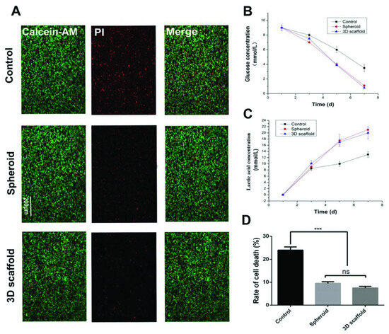 The culture of cancer cells culture on films (control), spheroids, and 3D scaffolds for seven days. (A) Fluorescence images of HCT-116 cells cultured on spheroids and scaffolds. Scale bar = 200 µm. (B) Plot showing HCT-116 cells’ glucose consumption on spheroids and scaffolds. (C) Plot showing lactic acid production by HCT-116 cells cultured on spheroids and scaffolds. (D) Rate of cell death in spheroids and scaffolds. *** p < 0.005. ns not significant. Reproduced with permission from [124]. © 2024 WILEY-VCH Verlag GmbH & Co. KGaA, Weinheim.