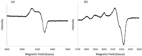 Powder Electron Paramagnetic Resonance (EPR) spectrum of Cu-[I-Cu]6 (a) and [I-Cu]n (b).