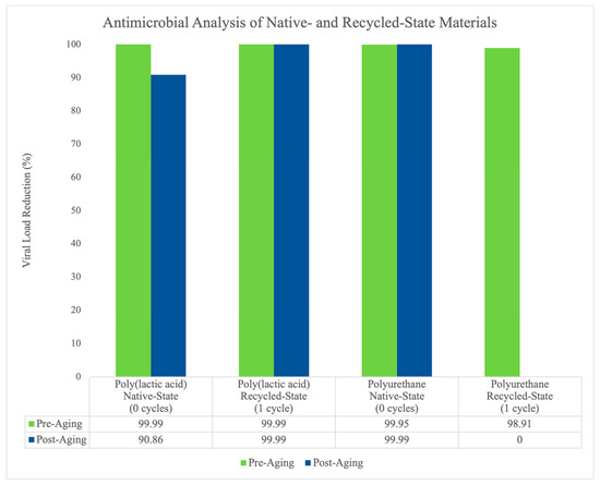 Bacterial analysis of antimicrobial efficacy and longevity for native- and recycled-state materials. Native-state poly(lactic acid) and polyurethane materials exhibit high biocidal activity, resulting in > 90% viral load reduction pre and post aging. Recycled-state polyurethane retains antimicrobial efficacy and longevity properties pre and post aging. Recycled-state polyurethane, however, shows high antimicrobial efficacy pre aging, resulting in 98.91% viral load reduction, but does not maintain longevity, decreasing to 0% viral load reduction post aging.