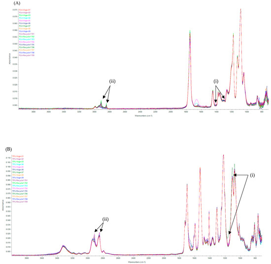 The poly(lactic acid)- and polyurethane-based materials were assessed for the presence of functional chemical groups, as well as potential feedstock chemical changes, using FTIR spectroscopy. Upon inspection of the infrared spectrum fingerprint region (1500 cm−1–400 cm−1), minor shifts can be observed in both poly(lactic acid)’s and polyurethane’s absorbance peaks following one closed-loop recycling cycle (Figure 2). Furthermore, some C-H stretching over time is present in both recycled-state materials (3300 cm−1–2800 cm−1). These observations are not universal across recycled-state materials and limited to a minority of the samples tested.