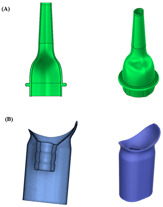 Cross-section analysis and full rendering of prototype medical devices: (A) prototype 4 mm × 5 mm adult size Gruber-style oval ear speculum, and (B) unisex urinary collection device were designed using 3D CAD modeling (Fusion 360, Autodesk Inc., San Rafael, CA, USA).