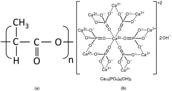 Materials based on calcium phosphates and biodegradable polymers are of the greatest interest. Composite mixtures of these materials may obtain unique functional properties, such as high restorability, sufficient mechanical strength, and the absence of negative reactions from the living body [4,5,6]. Composite materials based on polylactic acid and hydroxyapatite (PLA/HA) were recognized as the most promising biocompatible materials for bone implantation, since polymer based on lactic acid can decompose in a living body without the formation of toxic compounds, while the inorganic component—hydroxyapatite (HA)—is the main mineral component included in natural human bone tissue [7]. Moreover, HA has osteoconductive properties and a low resorption rate, so it can be widely used as a bone graft material [8,9].