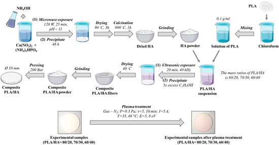 For obtaining the experimental composites PLA/HA, a polylactic acid solution was mixed with a hydroxyapatite powder under constant stirring. The mass ratios of the components were 80/20, 70/30, and 60/40 of the PLA and HA, respectively. The obtained suspension was ultrasonically treated for 20 min at a frequency of 40 kHz, then precipitated in a fivefold excess of ethyl alcohol. The precipitation process involves pouring the composite solution in a thin stream into a fivefold excess of ethyl alcohol, resulting in the formation of a ball of fibers. The obtained fibers were then dried until complete evaporation of the solvent in a desiccator at 40 °C. The obtained composite materials were mechanically pulverized, then molded on a laboratory hydraulic press at a pressure of 200 bar. The diameter of the obtained tablets was 10 mm. The general scheme of the sample preparation is presented in Figure 2. It should be mentioned that in the obtained composite materials, the polymer component (polylactic acid), and the inorganic component (hydroxyapatite) do not form chemical bonds with each other, i.e., only weak interaction forces are between them.