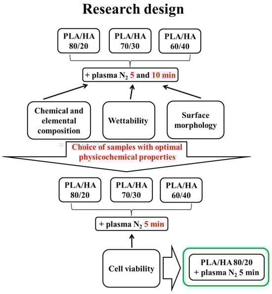 According to our previous results of the PLA scaffolds’ arc discharge plasma treatment in nitrogen flow [28], the PLA/HA 80/20, 70/30, and 60/40 composites were treated at similar plasma exposure parameters. The chemical and elemental composition, wettability, and surface morphology of the experimental samples were investigated. Based on the results, the PLA/HA composite samples with optimal physicochemical properties for further cell research were selected. The mode of the 5 min plasma treatment revealed the most significant effect on the change in the physicochemical characteristics of the PLA/HA surface. The viability of macrophages was evaluated in the presence of the 5 min nitrogen plasma-treated PLA/HA composites. The study design is summarized in Figure 3.
