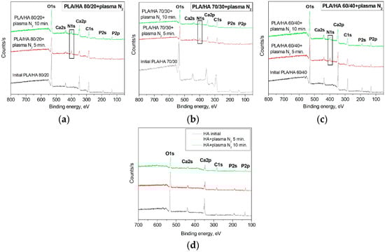 Figure 4 shows the survey XPS spectra for PLA/HA 80/20 (Figure 4a), 70/30 (Figure 4b), and 60/40 (Figure 4c) after the nitrogen arc discharge plasma treatment. These spectra reveal the presence of the main PLA/HA elements (calcium, oxygen, carbon, phosphorus), but a new peak with a binding energy of ∼399.9 eV, corresponding to atomic nitrogen, appeared following the nitrogen plasma treatment. The maximum atomic nitrogen content (12.74 ± 0.3 at. %) was observed in the surface layer of the 5 min plasma-treated PLA/HA 80/20 (Table 2). However, the higher the content of the inorganic component (HA 30% and 40%) in the composites, the less the atomic concentration of nitrogen after the plasma treatment. This is probably due to hydroxyapatite exhibiting inertness (or resistance) to surface plasma treatment in this energy range (5–8 eV), i.e., the energy of the incident particles in the plasma is not enough to penetrate the surface layer of hydroxyapatite. This is confirmed by the XPS spectra of pure HA (Figure 4d). No nitrogen peak was detected on the HA spectra after plasma irradiation. There are also no significant changes in the wettability characteristics and surface morphology. Therefore, we do not consider this material further in this paper.