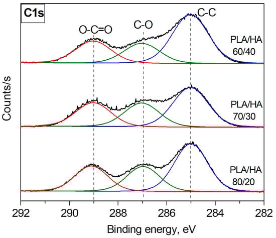 Figure 5 represents the C1s XPS spectra of the PLA/HA composites in their initial state (untreated). In these spectra, the position and shape of the C1s lines correspond to reference data on binding energies for PLA [33]. The content of carbon atoms in the –CH3-C, O-CH, and O-C=O combinations is shown in Table 3. The maximum content of the carbon atoms in the –CH3-C combination (53.55 at. %) was observed for the initial PLA/HA 80/20 sample. When the fraction of the inorganic component (hydroxyapatite) is increased in the composites, the content of this bond decreases to 48.93 at. % and 45.41 at. % for the PLA/HA 70/30 and PLA/HA 60/40, respectively.