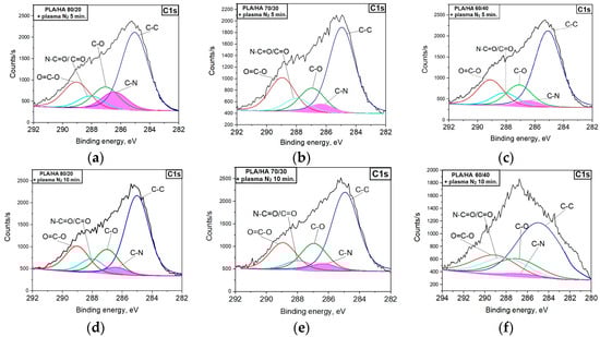 Figure 6 shows the C1s XPS spectra for the PLA/HA 80/20, 70/30, and 60/40 composites before and after the nitrogen arc discharge plasma treatments for 5 and 10 min. According to the XPS data (Table 3), the nitrogen plasma treatment leads to a decrease in the content of carbon atoms in the combinations of –CH3/C-C (Eb = 285.00 eV), O-CH (Eb = 286.98 eV) and O-C=O (Eb = 289.06 eV) for all the composites up to 40% compared to the initial state. Moreover, after plasma treatment, a new peak with a binding energy of ~286.40 eV was formed, corresponding to the carbon atom in the –C-N combination. The maximum values of the nitrogen-containing bonds were achieved when the composites were treated with plasma for 5 min (Table 3). With the increase in processing time to 10 min, the content of the –C-N bond decreased. In addition, after plasma treatment, N-C=O (Eb = 287.90 eV) or C=O-(Eb = 288.00 eV) bonds were formed in the surface layer of the composites [34]. The bond energies of these two carbon bonds are quite similar and there is no way to distinguish them, so we will denote them with a slash. The new bond formation processes are always accompanied by the rupture of the existing ones and the redistribution of the atoms that make up the polymer matrix of the composites.