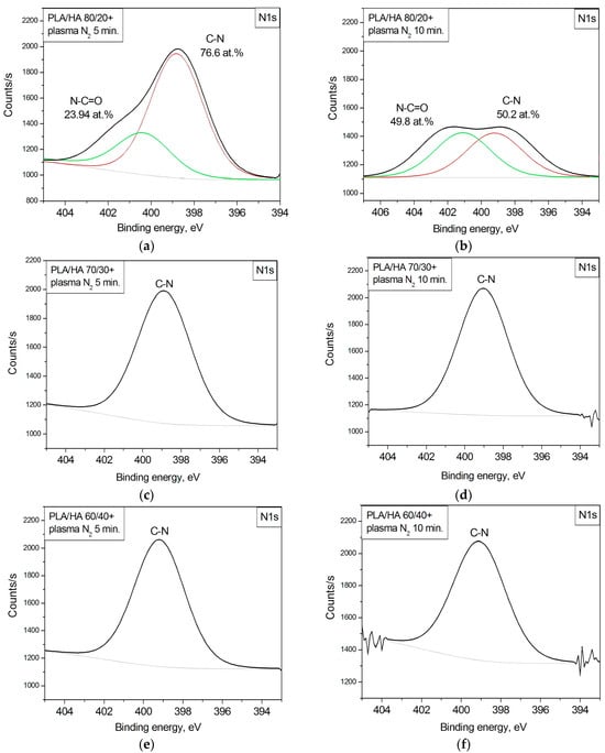N1s XPS spectra for the composites: (a) PLA/HA 80/20; (b) PLA/HA 70/30; (c) PLA/HA 60/40 after plasma treatment for 5 min; (d) PLA/HA 80/20; (e) PLA/HA 70/30; (f) PLA/HA 60/40 after plasma treatment for 10 min.