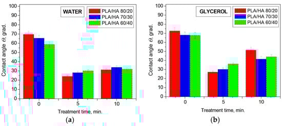 The minimum contact angles in contact with water (24°) and glycerol (30°) correspond to PLA/HA 80/20 after the plasma treatment under nitrogen flow for 5 min. It should be noted that after plasma modification, the contact angle for all the composites in contact with two liquids remained less than 90°, which means that the materials retained their hydrophilic properties. Moreover, the decrease in contact angles after plasma treatment indicates an increase in the hydro- and oleophilicity of the surface of the PLA/HA composites.