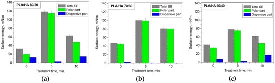 Surface energy dependence on the nitrogen plasma treatment duration for PLA/HA (a) 80/20, (b) 70/30, and (c) 60/40.