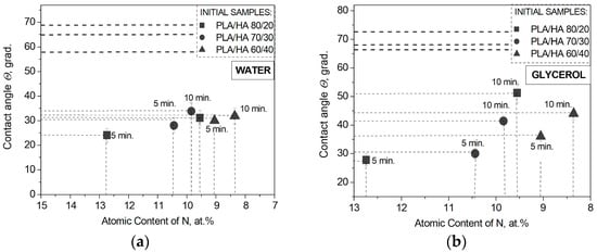 (a) Water and (b) glycerol contact angle dependence on the nitrogen atomic concentration in the PLA/HA composites’ surface layer.