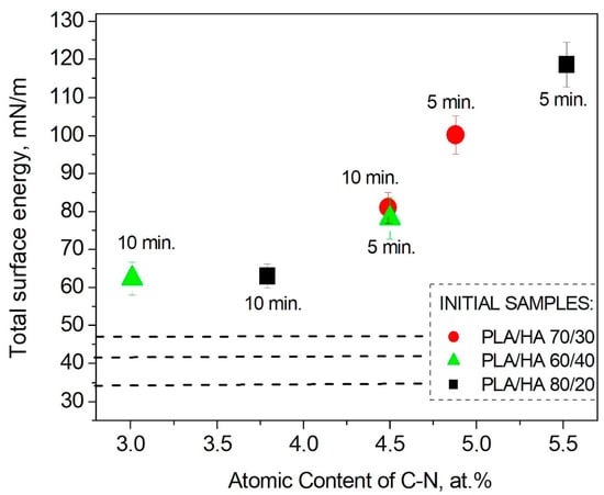 The dependence of free surface energy on the surface chemical composition of the plasma-modified composites was revealed. The formation of the –C-N bond was established to enhance the surface energy of the PLA/HA composites. The maximum content of the –C-N bond corresponds to the highest value of surface energy for all the types of composite after plasma treatment for 5 min (Figure 12). When the treatment duration increased to 10 min, the content of the –C-N bond decreased relative to the 5 min plasma exposure, and the free surface energy values for all the composites also decreased. Presumably, when treated with plasma for 5 min, the PLA/HA surface is saturated with nitrogen atoms (the concentration of nitrogen atoms reaches a threshold value), and a further increase in the treatment duration leads to the destruction of both the original polymer bonds in the composites and the rupture of the newly formed –C-N bonds. The decrease in the content of the –C-N bond, which is a polar functional group, leads to a decrease in surface energy, although its values remain higher than those for the initial non-plasma-treated composites (Figure 12). The decrease in the contact angles and the enhancement of the surface energy means that the surface of the modified PLA/HA samples becomes more wettable upon contact with liquids, probably due to the oxidative processes occurring in the surface layers under the nitrogen plasma treatment conditions [37].