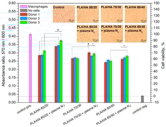 Macrophage viability in the presence of PLA/HA composites. Differences between unmodified and modified composites for each donor were noted; (*) existing differences from PLA/HA 80/20 composites are noted; (#) existing differences from PLA/HA 60/40 composites are noted (at p < 0.05). Magnification in photographs ×100.