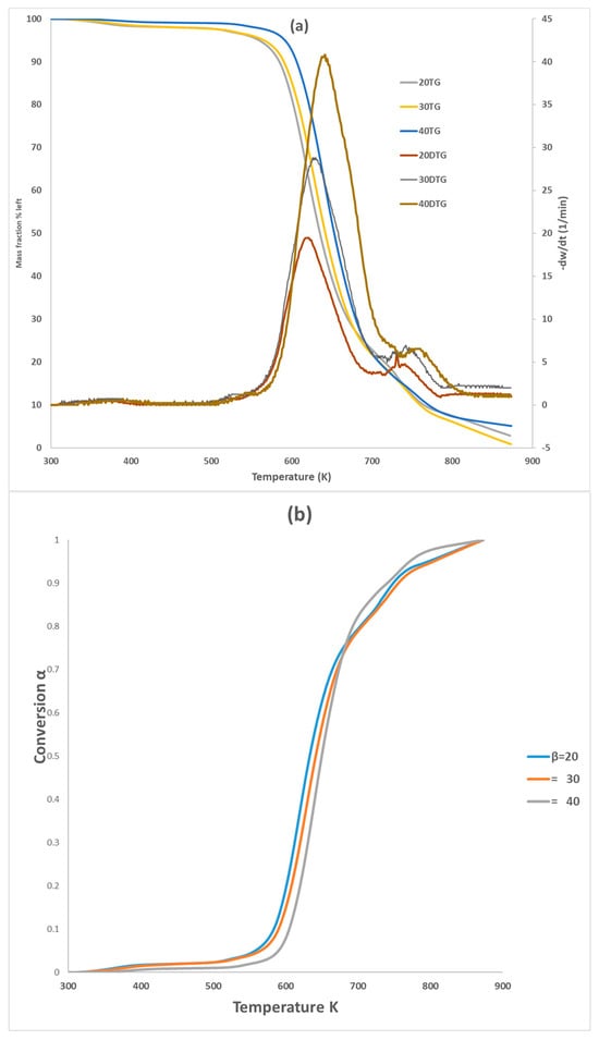 Figure 1 showcases the TG and DTG curves of PVA pyrolysis at heating rates of 20, 30, and 40 K min−1. The thermal decomposition behavior of PVA at different heating rates (20, 30, and 40 K min−1) is depicted in Figure 1 using TG and DTG curves. All three test samples were labeled with PVA20, PVA30, PVA40 labels throughout the paper to differentiate between different heating rates. The curves exhibit nearly identical behavior, but increasing the heating rate progressively shifts them to the right, particularly within the conversion range of 0.1 to 0.7. This suggests that a higher heating rate might influence the kinetics of PVA pyrolysis (Chowdhury et al. (2023) []). This phenomenon can be ascribed to the constraints imposed by heat transfer [] and occurred with a higher heating rate, where the reactant will not have enough time to react. Figure 1b shows the pyrolysis of PVA occurred in two-step reactions; the main one at 550–750 K with about 80% weight loss (water elimination, chain scissions to produce acetaldehyde, saturated and unsaturated aldehydes, ketones, and some volatiles) and the second with 700–810 K (intermolecular cyclization to produce volatile gases, and Char). It can be noticed that by increasing the heating rate, the peak for DTG increases for both reactions. In this work, a temperature range of 550–810 K was selected to concentrate on pyrolysis behavior of PVA. Table 4 presented the pyrolysis characteristic temperature for the three tests. Wang et al. (2018) [] also highlighted that the PVA pyrolysis can be considered as two steps; one between 230 and 320 °C for elimination reactions, followed between 320 and 500 °C for chain scission and cyclization reactions. For instance, Zhao et al. (2023) [] elucidated that the TG and DTG curves have very similar behavior with two peak reactions, (550–660 K) and (700–800 K), if they are compared with our curves for the common heating rate 20 K min−1. The difference in the characteristic temperatures between the published papers could be attributed to the experimental conditions, sample source and size, operating pressure, and carrier gas flow rate. This can be explained that by increasing the heating rate, samples require a higher peak temperature to establish the same decomposition rate.