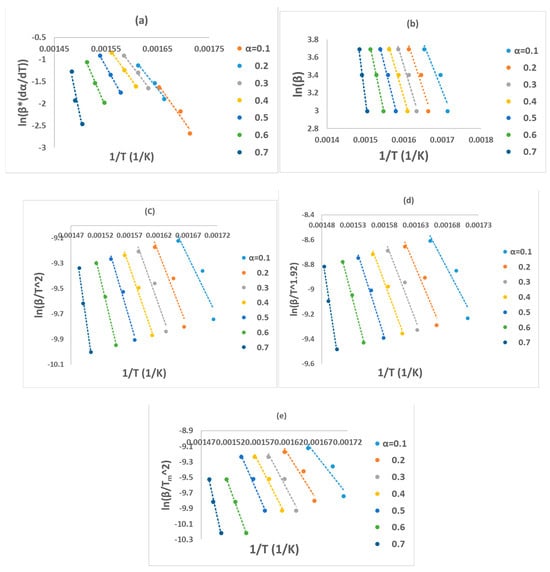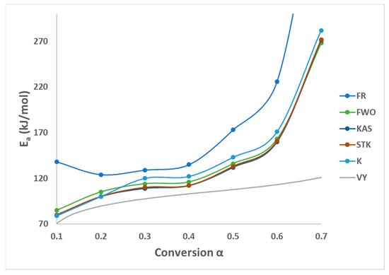 All these six methods are the most effective and reliable to calculate the activation energy for non-isothermal, isoconversion, multiple heating rate. The difference between them is the assumptions that have been made for each method in deriving the final model. Activation energy (Ea) represents the minimum energy barrier a reaction must overcome. Higher Ea values result in decreased reaction rates, as fewer collisions possess the necessary energy. Equations (3)–(7) are applied by plotting (, on Y-axis versus 1/T in the conversion range (0.1–0.7) as shown in Figure 2. Figure 1b shows that above 0.75 conversion, the normal trend “increasing the heating rate progressively shifts them to the right” has been disturbed. Therefore, only (0.1–0.7) conversions have been selected in this calculation since the model-free methods used more than one heating rate. Using different kinetic models, the activation energy was calculated from the slopes of fitted straight lines to the curves. The data for activation energy as a function of the conversion range (0.1–0.7) is presented in Figure 3 and Table 5. Kinetic calculation software (software version: 1) has been used to solve the Vyazovkin method (Drozin et al. (2020) []). This paper introduces the basic features of this software. Activation energy values for conversion range (0.8–0.9) have been neglected because the normal trend “shifting to the right as the heating rate increases” is not present, but still Figure 1a shows a very clear small reaction. Table 5 presented the activation energy values as a function of the conversion range (0.1–0.7) for six model-free models. The conversion range (0.1–0.7) for all methods (Figure 3) could be divided into two regions; one with (0.1–0.5) range, where the activation energy values almost constant; and the second one with higher than 0.5 conversion, and Ea values that would slowly increase until conversion 0.7. Moreover, the average activation energy (280 kJ mol−1) at 0.7 conversion is the highest value compared with the rest of the conversion (0.1–0.6). This difference could be attributed to the beginning of the second reaction. Notably, the activation energies calculated by FWO, KAS, ST, and K methods exhibited the same trend across the conversion range, confirming the reliability of these values. However, consistent with previous studies, FR methods yielded slightly higher activation energy values compared to the first four methods. Mittal et al.’s (2020) [] study revealed that the formation of thermally stable char above 0.6 conversion significantly impacted the pyrolysis of PVA, as evidenced by a tenfold increase in activation energy for the FR model (from 86.28 to 986.16 KJ mol−1) as conversion progressed from 0.1 to 0.9.