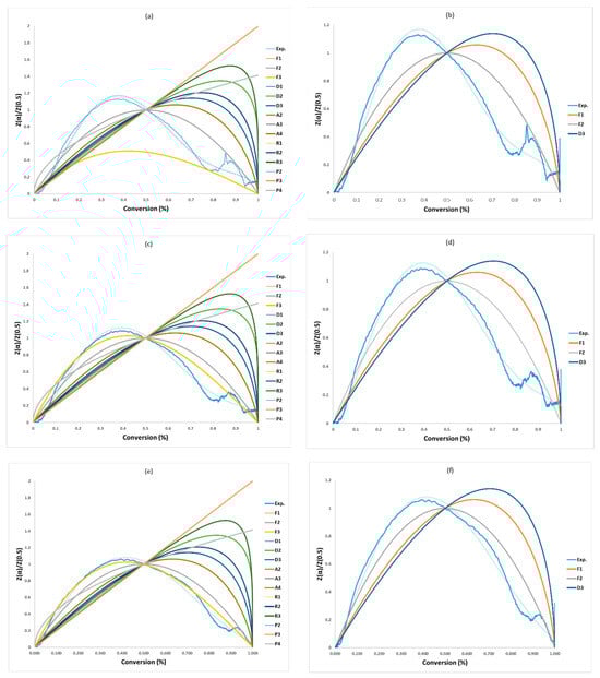 Masterplots of different kinetic models: (a,b) PVA20, (c,d) PVA30, (e,f) PVA40.