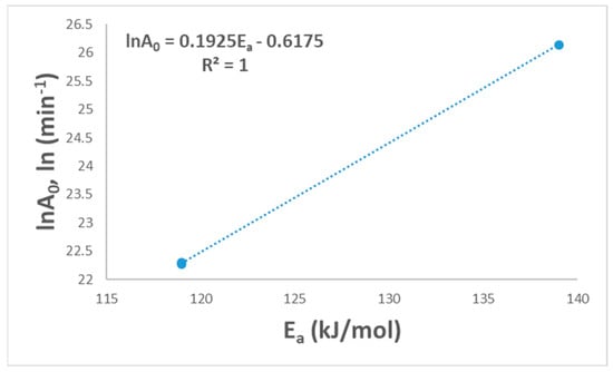The final selection mechanism could be applied to find the linearity between lnA0 and Ea. Figure 5 shows the linear relationship with a (R2 = 1.0), and this shows the suitability of the suggested model for PVA pyrolysis. This relationship between A0 and Ea is called the kinetic compensation effect [].
