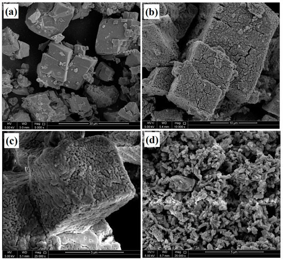 SEM images of the CaCO3 before and after the heat treatment and loading with the corrosion inhibitor are depicted in Figure 2, showing the structural changes during the heat treatment and loading. Figure 2a shows a smooth surface with a hexagonal geometry of the CaCO3, which converted into a porous structure after the heat treatment of the calcium carbonate, as shown in Figure 2b,c. However, the heat treatment did not affect the hexagonal structure of the CaCO3, which remained the same, but some cracks and porosity were observed due to the emission of CO2 during the heat treatment. Figure 2d depicts the anti-corrosive pigment that was loaded into CaCO3 with sodium alginate. The particle size was reduced significantly after loading with the inhibitor, and the calcium carbonate deformed from its original loading process due to the treatment with water. The sodium alginate flakes filled the pores and covered the CaCO3, which was also observed during the BET analysis.