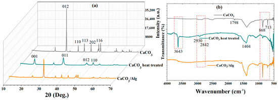 (a) XRD and (b) FTIR analysis of CaCO3 (Grey color), CaCO3 after heat treatment (Green color), and CaCO3/Alg (Orange color).