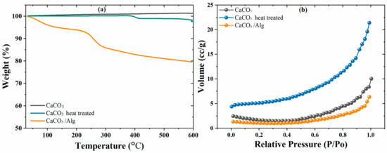 (a) TGA and (b) BET analysis of CaCO3, CaCO3 after heat treatment, and CaCO3/Alg.