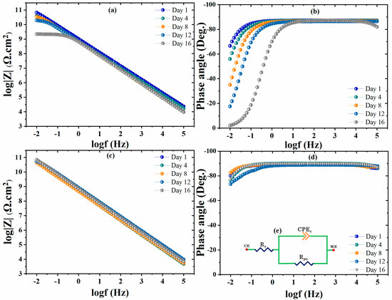The corrosion inhibition behavior of the non-modified and modified coated samples was analyzed by EIS analysis after 16 days of immersion in 3.5 wt.% NaCl solution. The fitted EIS spectra for the non-modified coatings (blank polyolefin) and modified coatings (CaCO3/Alg) are depicted in Figure 5. Furthermore, the equivalent circuit used to obtain the fitting data is depicted in Figure 5d. Initially, the EIS spectra for the non-modified coating showed a higher impedance value of ~100 G Ω·cm2 for one week, which declined to 1 G Ω·cm2 on the 16th day of immersion. The electrolyte uptake through the micropores caused a decrease in the overall corrosion protective behavior of the non-modified polyolefin coating. The broadening of the horizontal area at a lower frequency of the EIS spectra of the non-modified coating shows a decrease in the capacitive behavior of the unmodified coatings. Corrosion activity at the low-frequency region of the phase angle can also be observed due to a shift in the phase angle towards zero (0°). An increase in the active surface area is indicated by a reduction in the capacitive response, which caused a loss in the corrosion protection behavior of the coatings. Overall, it was decreased by two orders of magnitude in the non-modified coating after 16 days of immersion.
