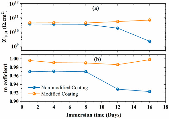 (a) Low impedance values with (b) m-coefficient of capacitance of non-modified and modified coatings.