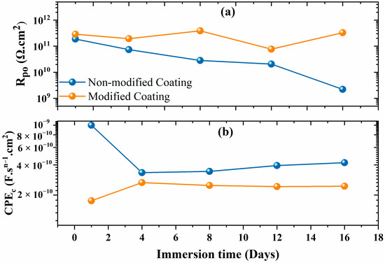 (a) Pore resistance and (b) CPEc of the non-modified and modified coatings.