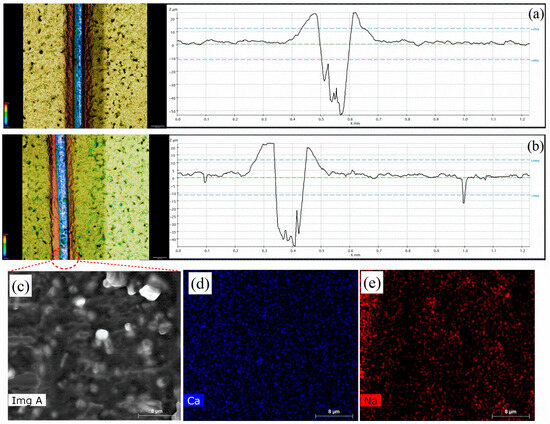 Profilometer images of the (a) non-modified and (b) modified coatings; (c) SEM and (d,e) elemental mapping image of scratched region of modified coatings.