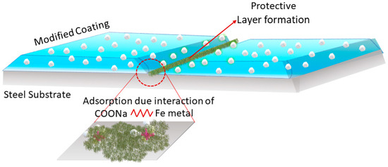 Figure 10 shows a schematic diagram of the protective film formation in the modified coating. The scratched area formed a protective layer due to the adsorption of the protective layer on the steel substrate. The sodium alginates had the ability to form a protective film on the steel substrate due to the interaction between the functional group (-COONa) of sodium alginate and the metal ions. The film led to a decrease in the depth of the scratch of the coatings, as demonstrated in the profilometry image of the modified coating. The film also helped to isolate the electrolyte from the steel substrate, due to which the electrolyte uptake was less in the modified coatings [30].