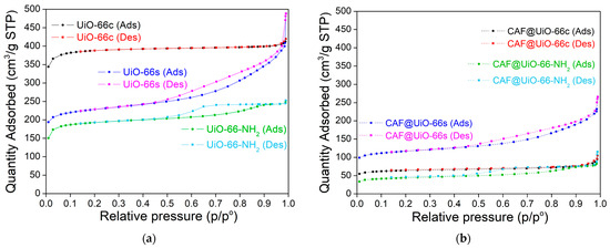 Nitrogen adsorption–desorption (Ads-Des) isotherms of UiO-66c, UiO-66s, and UiO-66-NH2 before (a) and after (b) caffeine encapsulation.