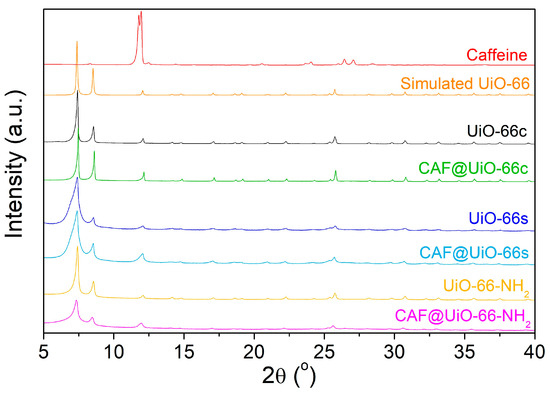 XRD spectra of UiO-66s, UiO-66c, UiO-66-NH2, and simulated UiO-66 using Mercury 3.8 software [54] and CCDC 1018045 [55] from Cambridge Crystallographic Data Centre. The XRD of the samples after the caffeine encapsulation process are also shown.