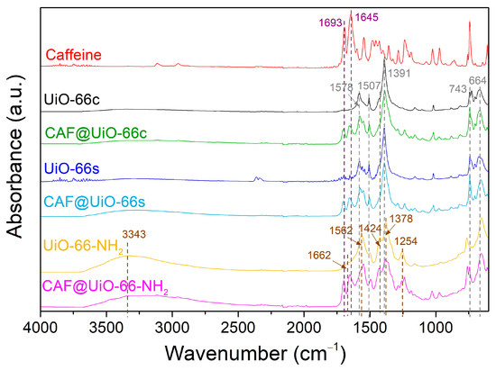 The presence of caffeine in the encapsulated samples was affirmed by using FTIR spectroscopy, as shown in Figure 4. In the spectra of caffeine, some typical bands were identified at 1693 and 1645 cm−1, corresponding to the carbonyl bond C=O. Slight shifts in carbonyl groups were detected in the spectra of CAF@UiO-66c (from 1693 and 1645 cm−1 to 1701 and 1653 cm−1), in the spectra of CAF@UiO-66s (to 1701 and 1654 cm−1), and in the spectra of CAF@UiO-66-NH2 (to 1698 and 1652 cm−1). These shifts suggest interactions between caffeine molecules and UiO-66 groups [34]. In the FTIR spectra, the main functional groups in the MOF are shown to have been preserved in the CAF@UiO-66 samples.