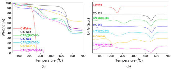 TGA (a) and DTG (b) analysis of UiO-66c, UiO-66s, and UiO-66-NH2 samples before and after caffeine encapsulation. TGA was carried out under nitrogen flow.