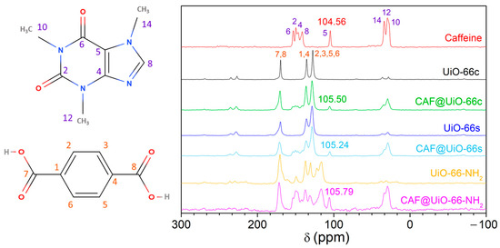 The 13C CP MAS NMR spectra (Figure 7) were achieved for pure caffeine, both UiO-66, UiO-66-NH2, and the caffeine encapsulated samples (CAF@UiO-66c, CAF@UiO-66s and CAF@UiO-66-NH2). The observed chemical shifts (in ppm) for caffeine correspond to 27.8 (C10), 29.61 (C12), 33.82 (C14), 104.56 (C5), 141.40 (C8), 146.55 (C4), 149.65 (C2), and 153.01 (C6) [62]. The NMR spectra of UiO-66 contain three peaks located at isotropic chemical shifts of 127.52 ppm (C2, C3, C5, C6), 135.53 ppm (C1, C4), and 169.78 ppm (C7, C8). The peak at the high chemical shift corresponds to carbon atoms from a carboxylic group. The peak at 127.52 ppm is assigned to carbon atoms bonded to a proton. The peak at 135.53 ppm corresponds to quaternary aromatic carbon atoms [63]. Peaks corresponding to pure caffeine are clearly seen in the encapsulated samples, in C5 105.50, 105.24, and 105.79 ppm for CAF@UiO-66c, CAF@UiO-66s, and CAF@UiO-66-NH2, respectively, with a slight change in chemical shift as compared with the caffeine spectra (104.56 ppm), suggesting the encapsulation of the additive. The intensity of these peaks is lower for encapsulated samples. In addition, the peaks of UiO-66 were observed in the ball mill samples, indicating the preservation of the UiO-66 structure.