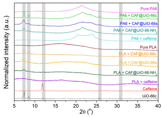 Figure 8 represents the XRD spectra of the PA6 and PLA composites with capsules and with pure caffeine. The pure polyamide shows a wide peak around 2θ = 21.4°, characteristic of γ-PA6 [64], which indicates its semi-crystalline character. With the presence of capsules or caffeine, three peaks are related to PA6, the one just indicated above at 2θ = 21.4°, and two new peaks at 2θ = 20.4° and 23.7° related to α-PA6 [64,65]. This would indicate a certain degree of change in the crystalline character of PA6 with the presence of the filler. The pure PLA shows a practically amorphous character with a very wide peak centered at 2θ = 16° that seems to vary with the addition of capsules based on caffeine or pure caffeine, which would suggest a certain degree of interaction of these materials with the PLA polymer. According to the XRD results, some characteristic peaks of the UiO-66 are present in the sample composites with capsules, indicating the presence of the capsules and providing evidence that the crystalline structure of the MOF was maintained after the extrusion process. For polymer composites with synthesized UiO-66, the observed peaks are broader, as occurred in the XRD of the solid samples (see Figure 3). In the case of the PA6 and PLA composites with pure caffeine, there are no visible peaks corresponding to this additive.