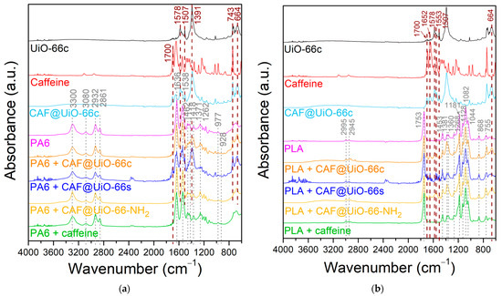 FTIR spectra of polymer composites of UiO-66 encapsulated samples and pure caffeine: (a) PA6. (b) PLA.