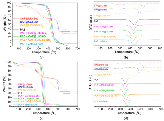 The prepared PA6 and PLA composites were characterized by TGA (Figure 10). The TGA curves of the pure PA6 composites (Figure 10a) show differences between the pure polymer and PA6 with capsules. In that of PA6, there is a small continuous degradation (<5 wt%) between 100 and 250 °C that may be related to unreacted reagents and small amounts of water. The large mass loss related to the degradation of the polyamide begins at around 350 °C with a maximum in DTG at 445 °C (Figure 10b). In the PA6 with capsules, the degradation of the sample occurs earlier than in the pure PA6, with a maximum in DTG at 432 °C, 420 °C, and 430 °C for UiO-66c, UiO-66s, and UiO-NH2, respectively. This faster degradation may be due to a slight catalytic effect of the MOF present in the capsules since the degradation of PA6 with pure caffeine has a maximum DTG (446 °C) at the same temperature as the pure PA6. In the polymer composites with capsules and pure caffeine, there is a detectable weight loss in the DTG before the degradation of the polymer, which could be related to the presence of caffeine as well as stabilization since it occurs at higher temperatures than pure and encapsulated caffeine. Furthermore, in the polymer composites with capsules, a clear weight loss is shown after the degradation of the polymer, which may be due to the MOF. This represents an acceleration in the degradation of the MOF, probably due to the caloric effects of the degradation of the polymer, which indicates good integration of the capsules in the polymer. It should be noted that, in these samples, the final residue of the TGA carried out in the air is ZrO2.