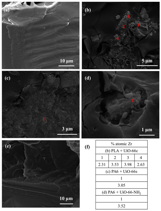 Figure 11 and Figure 12 show the SEM images of the PA6 and PLA composites. As expected, for the pure PA6 composite no particle was observed (Figure 11a). In the composites with CAF@MOF, UiO-66 particles were seen in the PA6 composite cross-section (Figure 11b–d) with a shape very similar to the particles before being added to the composite and showing good contact between the capsules and the PA6. This would be related to the organic character of the MOF that makes it compatible with the polymer. In general, regardless of the type of capsule, both isolated particles (Figure 11b) and particle aggregates (Figure 11c,d) can be found in the samples, although in the sample with UiO-66c, the particles are less aggregated. On the samples with capsules (Figure 11b–d), EDX analysis was performed at the indicated points. The Zr atomic percentage values of the EDX analysis of these composites are shown in Figure 11f. In the PA6 + CAF@UiO-66c sample, the Zr element was detected by EDX analysis at different points of the solid particle. Another zone away from this particle was also analyzed (point 4), where the Zr percentage was zero. In the composite sample with synthesized UiO-66, zirconium was also detected in an aggregate of particles reaching values around 2.5 at%. If a larger aggregate of particles is analyzed, such as the one in the composite of UiO-66-NH2 capsules, zirconium is detected in greater quantities (Figure 11f). In any case, with the EDX analysis and the preservation of its shape, it is possible to confirm the presence of the MOF after the composite manufacturing process. It should be noted that the composite manufacturing process occurs at 260 °C, a temperature which, as has been observed in the TGA, the MOF capsules with caffeine can withstand. Figure 11e clearly shows the caffeine crystals inside the PA6 composite, which indicates that the pure caffeine added to the composite is also capable of withstanding the processing conditions, as was already intuited in the TGAs of the composites.
