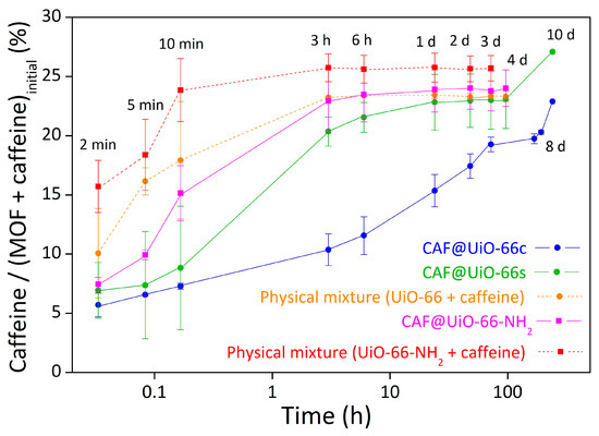 Release experiments of solid samples, CAF@UiO-66c, CAF@UiO-66s, CAF@UiO-66-NH2, and a physical mixture of both MOF with caffeine, determined by UV–Vis absorption. The error bars come from the measurement of two samples prepared in different batches.