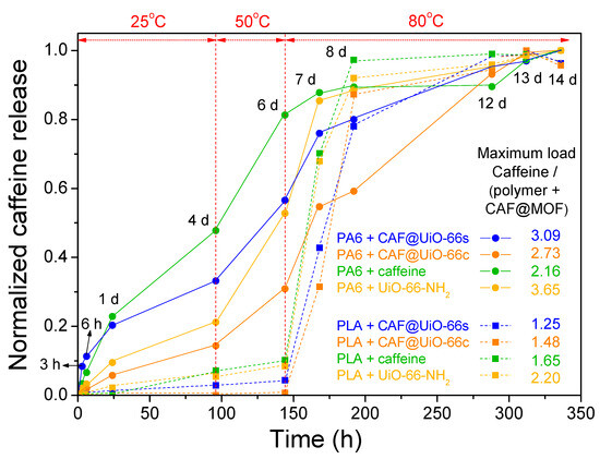 Normalized values of caffeine release in PA6 and PLA composites showing the evolution with time and temperature. The amount of composites introduced was 7.956 g, 8.414 g, 7.398 g, and 7.981 g for PA6 composites (UiO-66c, UiO-66s, caffeine, and UiO-66-NH2) and 9.380 g and 9.4261 g for PLA composites (UiO-66c and caffeine).