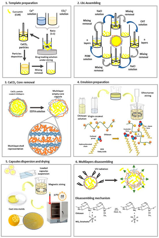 Representation of the methodology employed to prepare the CHT/VCO/ CUR loaded capsules system. Corresponding the Scheme (1–3) to the CUR loaded capsules preparation; (4) to emulsion solution preparation; (5) to capsules dispersion and emulsion film molding and drying; and (6) to the mechanism of release of CUR from the loaded LbL capsules employed.