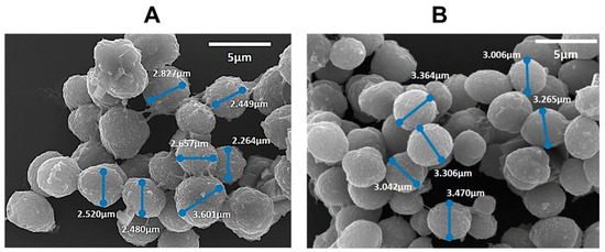 SEM of the (CHT/POM)5 non-loaded (A) and CUR loaded (B) capsules. Scale bar: 5 µm.