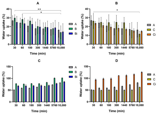 The area variation studies included in Figure 5, are also in accordance with the observed swelling behavior, being the higher mass increase observed for the samples immersed in PBS, with significantly relevant statistical differences observed (Figure 5C,D). At pH 5 buffer, besides the lower increase observed for the samples in the different compositions, it is also noted that a plateau is achieved in the first minutes of immersion, the differences along time being almost negligible (Figure 5A,B). Particularly regarding the C and Ci formulations, where CUR was present, just for the non-irradiated sample (C) a difference was observed between after 0.5 h and 7 days of immersion in pH 5 buffer.